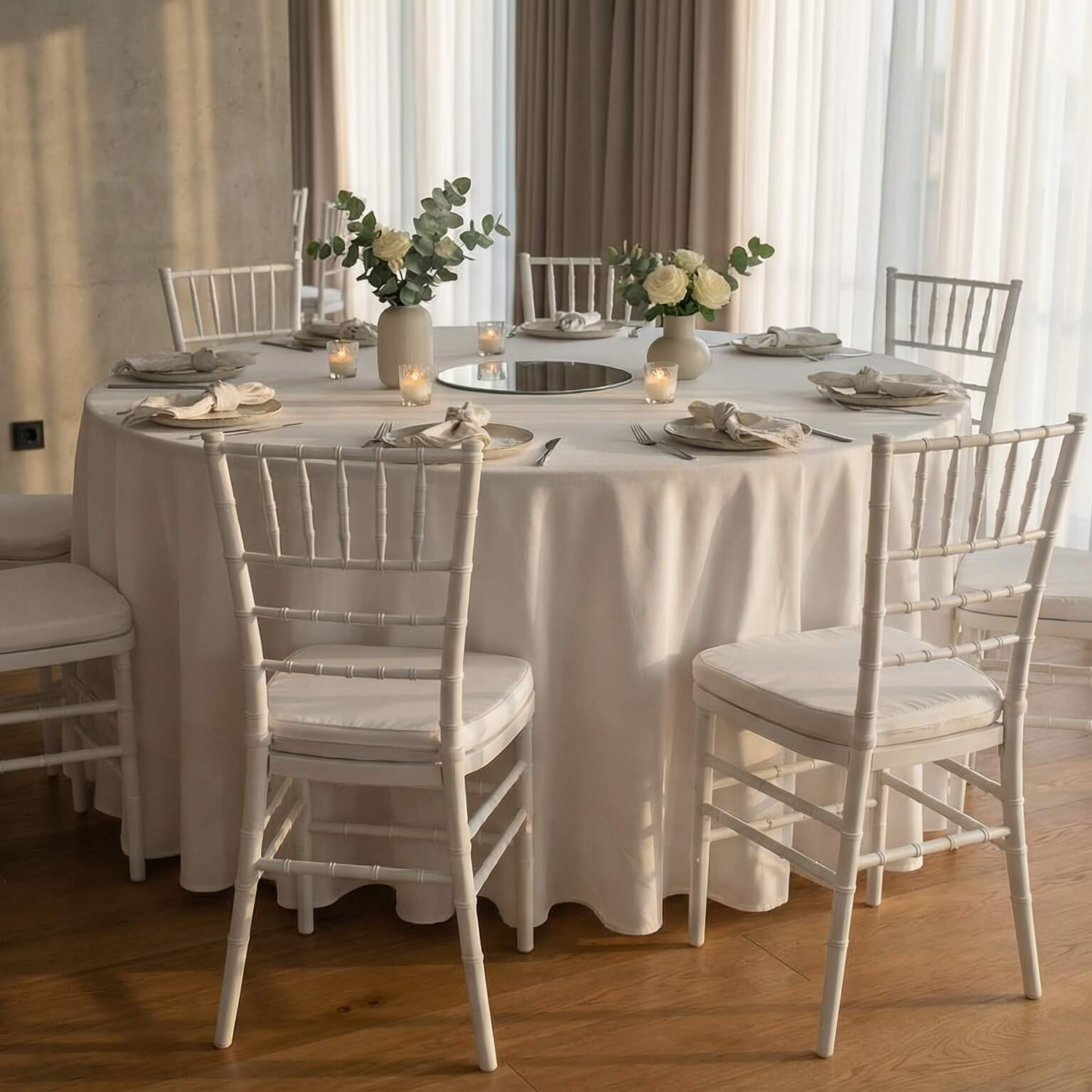 Этот сет предназначен для камерных мероприятий и компактных пространств. Включает один стол и 4-10 стульев с простой и элегантной расстановкой - идеально подходит для небольших ужинов, фотосессий, частных встреч или временных мероприятий.